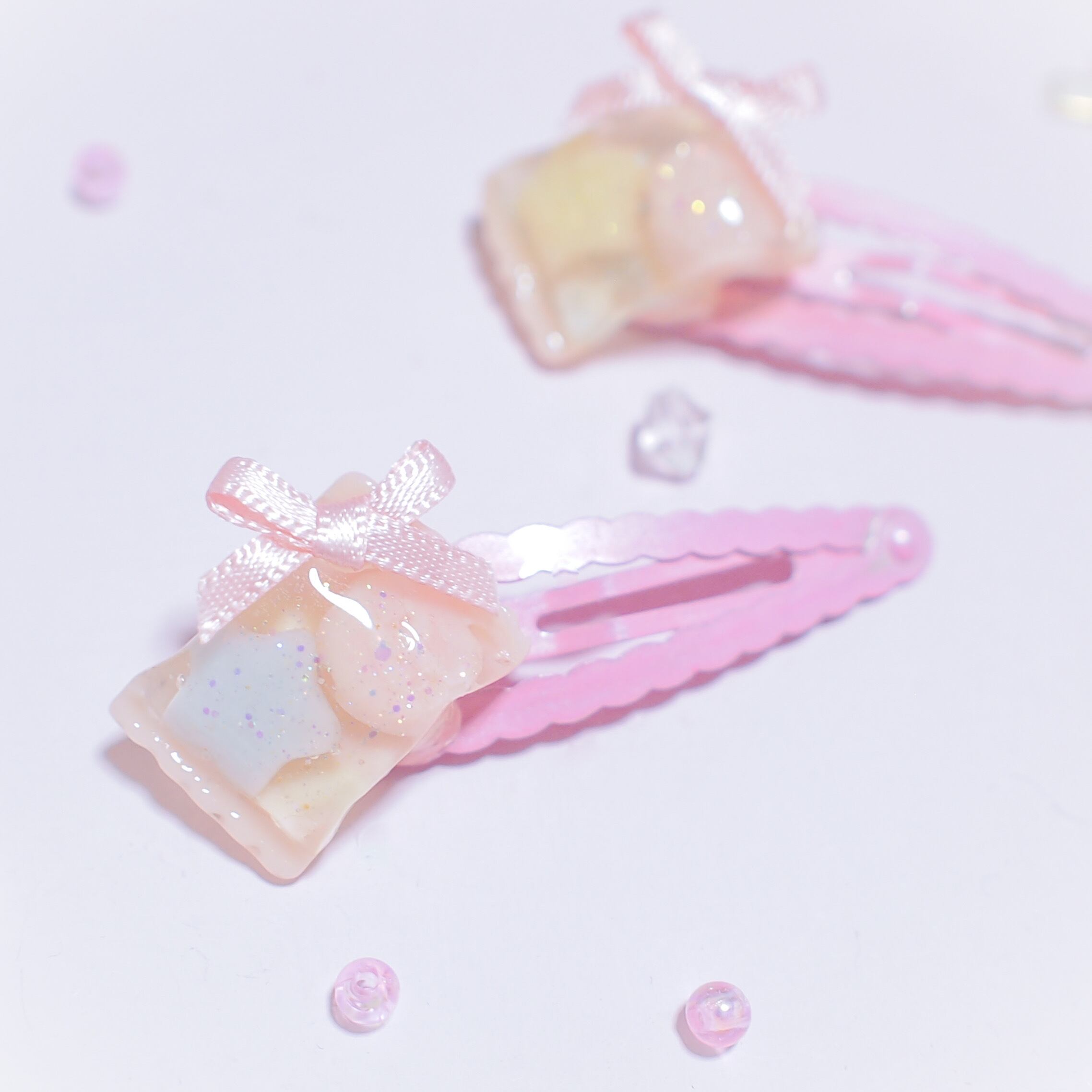 ◌ レジンで作った2つぶのちいさなキャンディが透けて見える、とってもゆめかわいいヘアピンです。